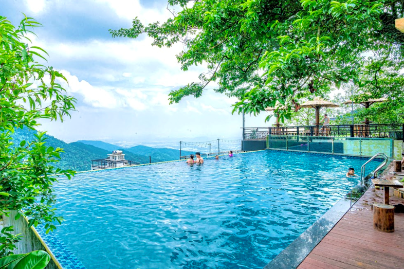 Bể bơi vô cực rộng 120m2 có khu vực dành cho trẻ em độ sâu nước 80cm